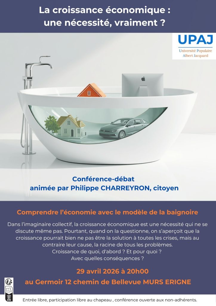 En s’appuyant sur l’analogie de la baignoire, Philippe Charreyron abordera la différence entre flux et stock pour questionner la pertinence du PIB comme indicateur de richesse, et il s’intéressera à la décroissance, vue non pas comme un projet de société mais comme une étape nécessaire vers une société sans croissance. Nous donnons rendez-vous le 29 avril à tous les citoyens qui souhaitent mieux décrypter l’actualité