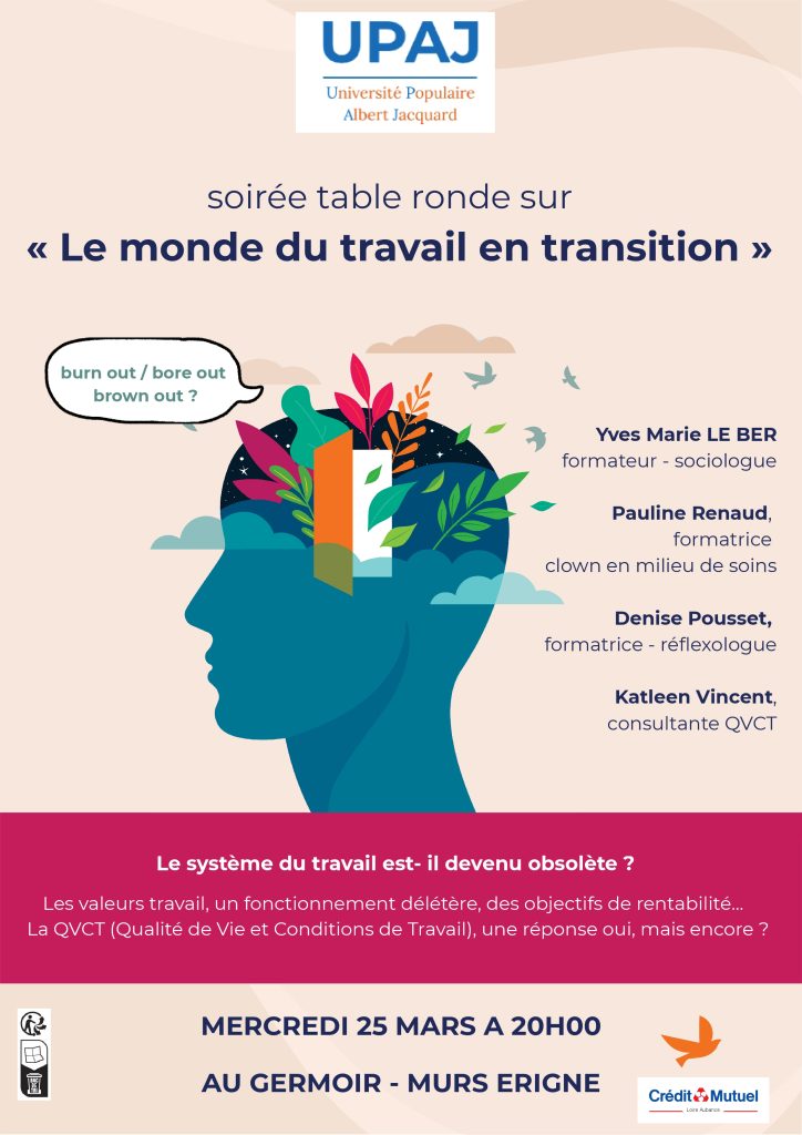 Yves Marie Leber, formateur/ sociologue, Pauline Renaud, formatrice/ clown en milieu hospitalier, Denise Pousset, formatrice/ réflexologue, Katleen Vincent, Consultante en QVCTanimeront cette soirée d’échange et de réflexion avec la volonté de trouver des perspectives qui donnent (redonnent) du sens…tel est l’enjeu !